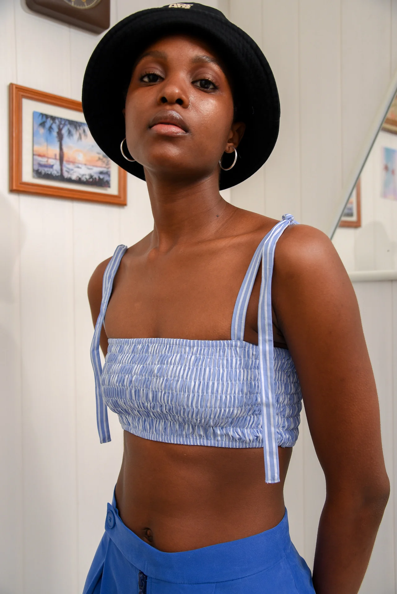 The Breadfruit Top is your new go-to for effortless charm. Made from lightweight fabric with a ruched, elasticated bodice for a snug fit. Delicate tie straps add a playful touch while allowing an adjustable fit. soft pink hue and subtle stripes make it perfect for pairing with high-waisted bottoms for an easy, breezy look.