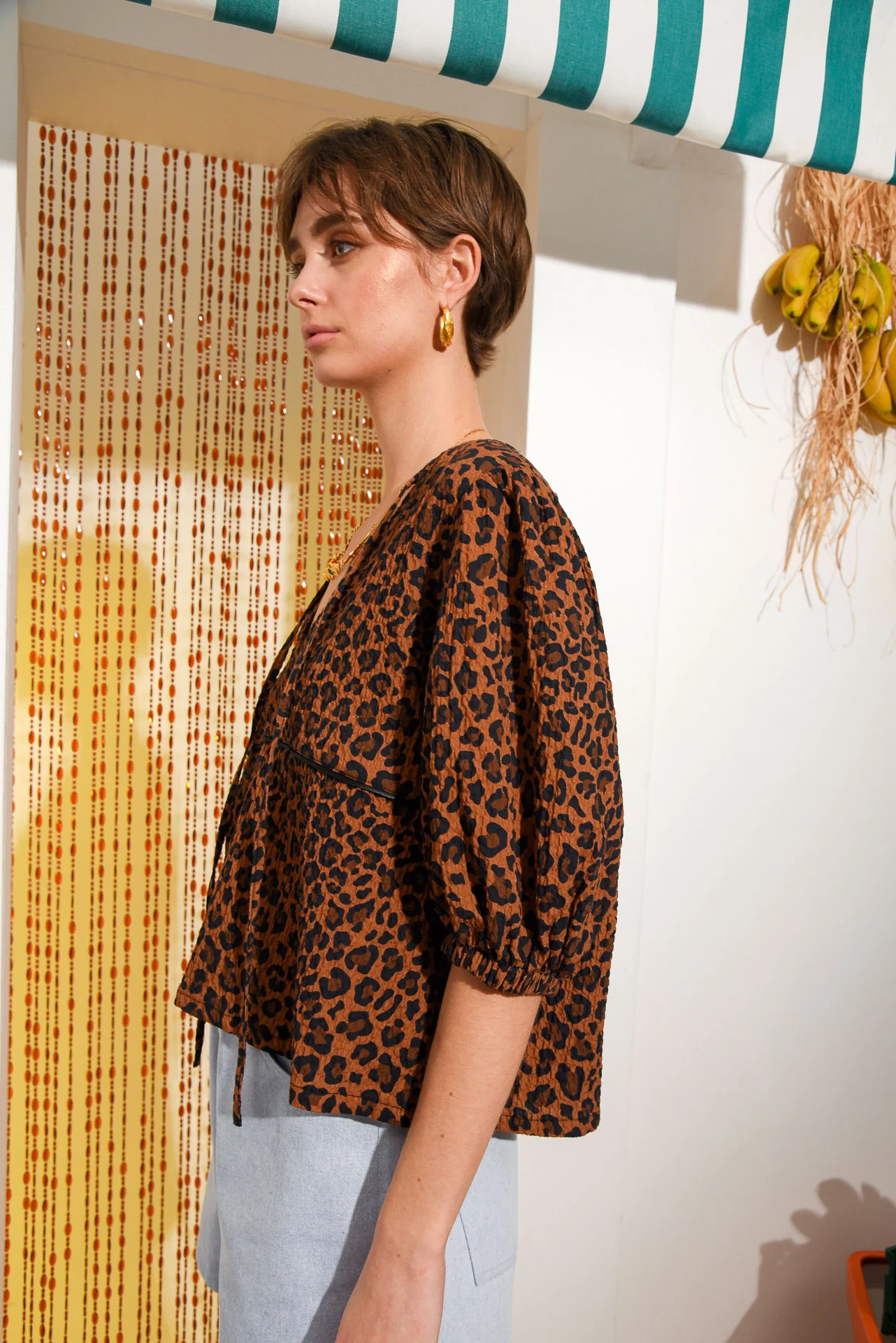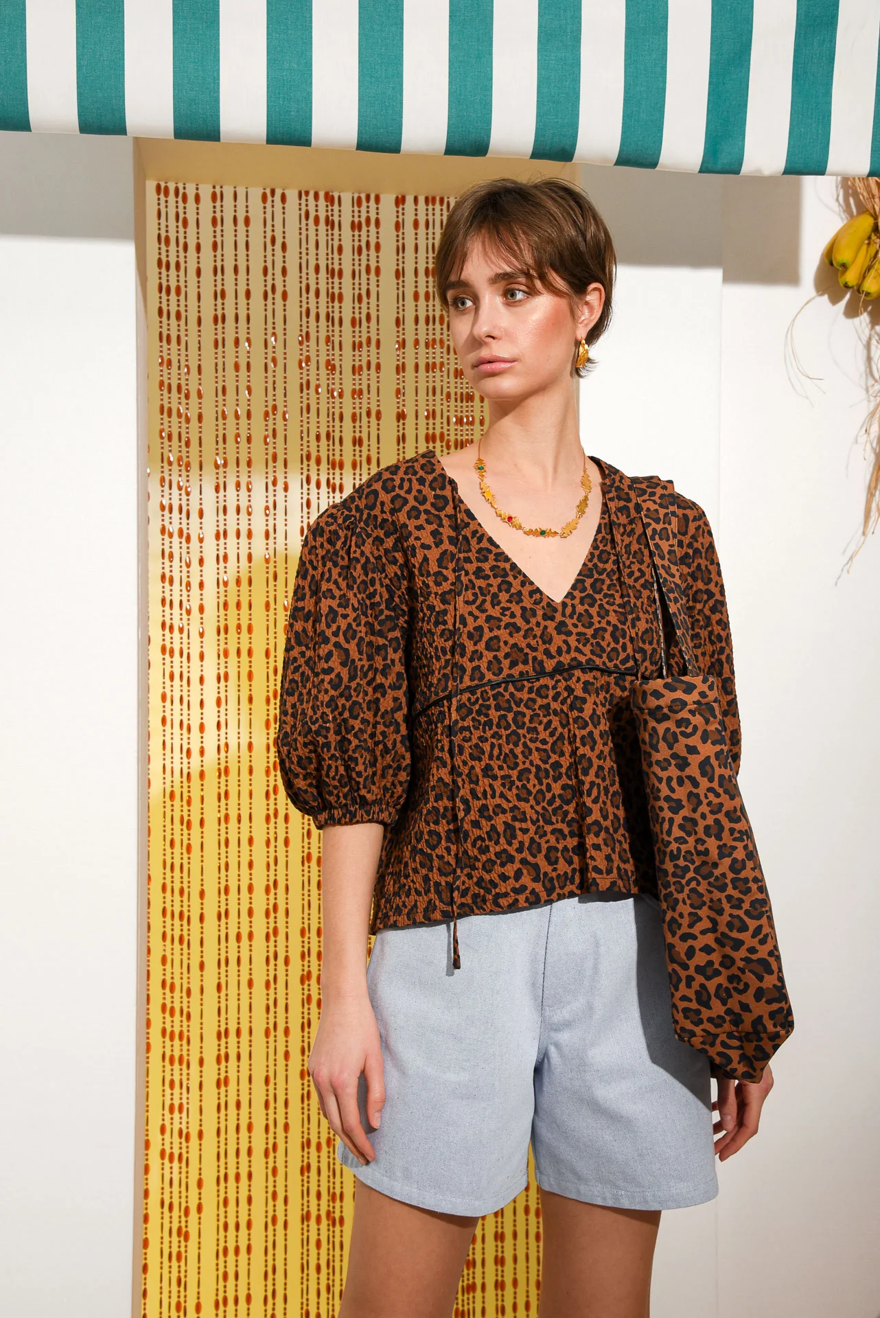 The Curry top is made from soft, textured fabric with an all-over brown leopard print. It features a deep V-neckline, a loose fit, three-quarter puffed sleeves with elastic cuffs, and a gathered waist seam for added shape. A fine drawstring detail at the neckline completes the look.