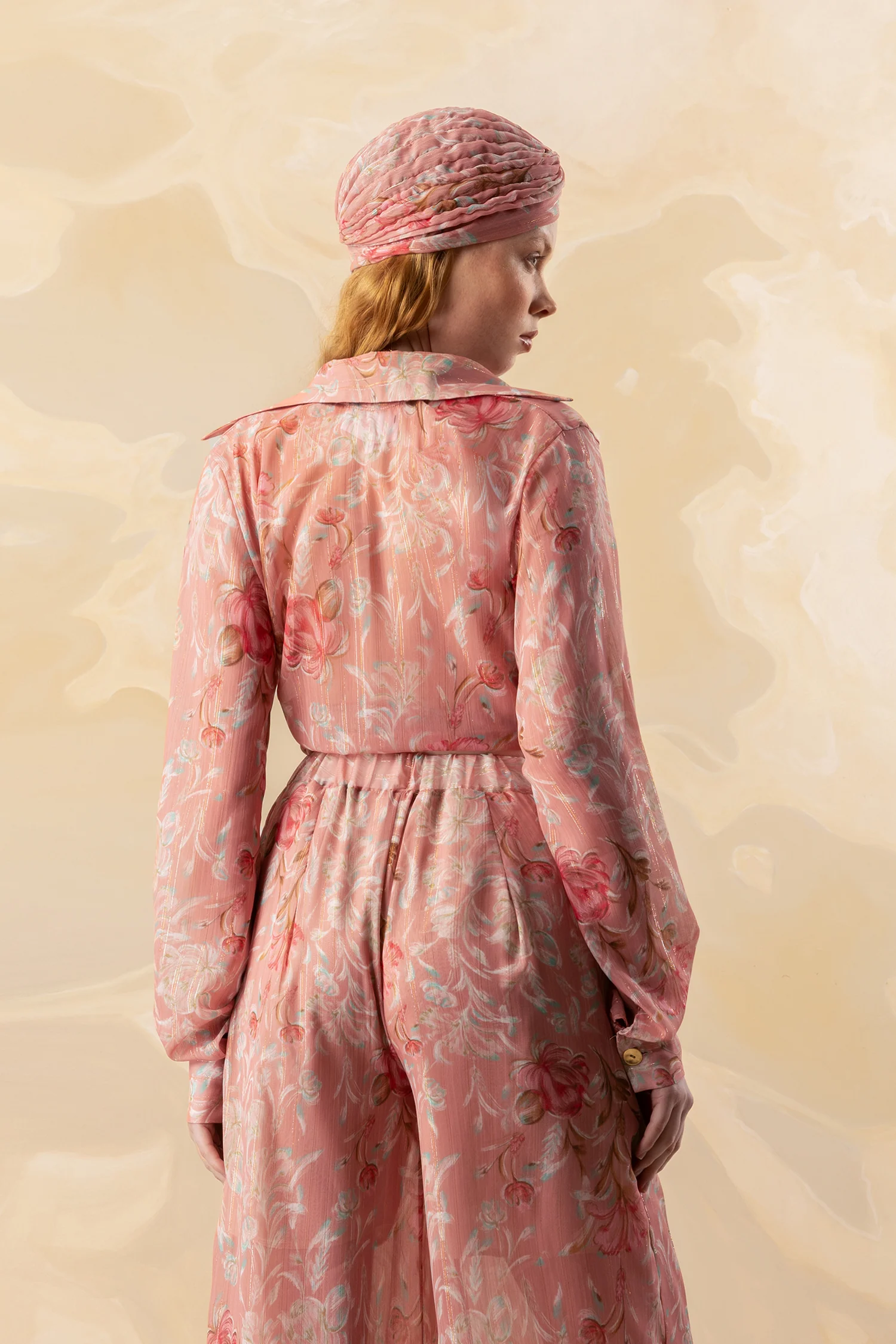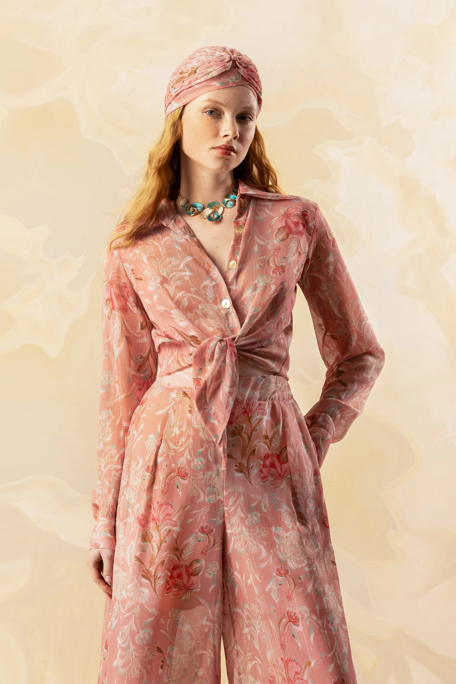 Ροζ φλοράλ πουκάμισο με δέσιμο & χρυσή ρίγα