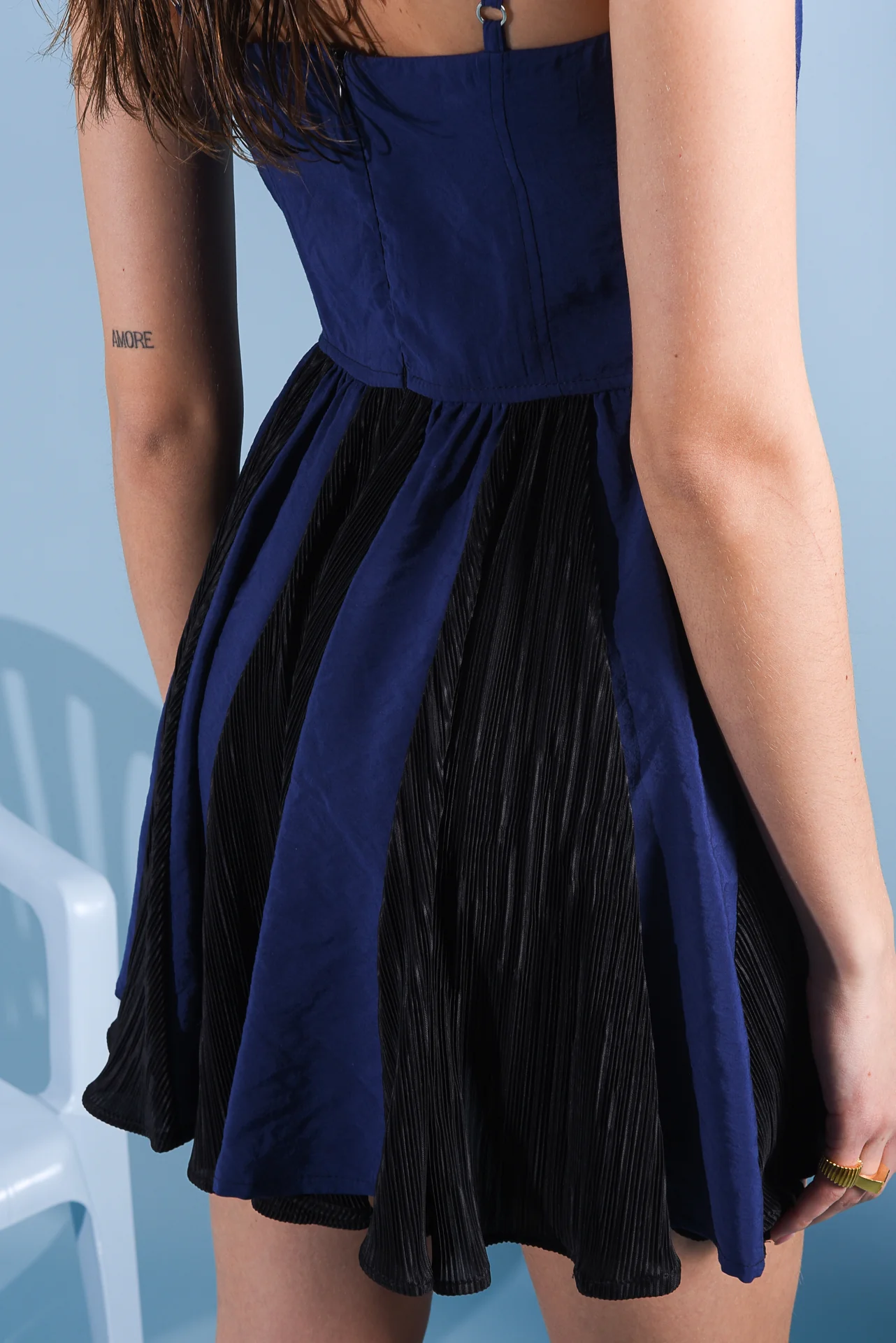 Introducing the Ellena Dress: a chic, mini-length piece with a corset top featuring a heart-shaped décolleté. The closs skirt combines gofre and modal fabrics for a stunning effect. Adjustable straps and a back zipper ensure a perfect fit.