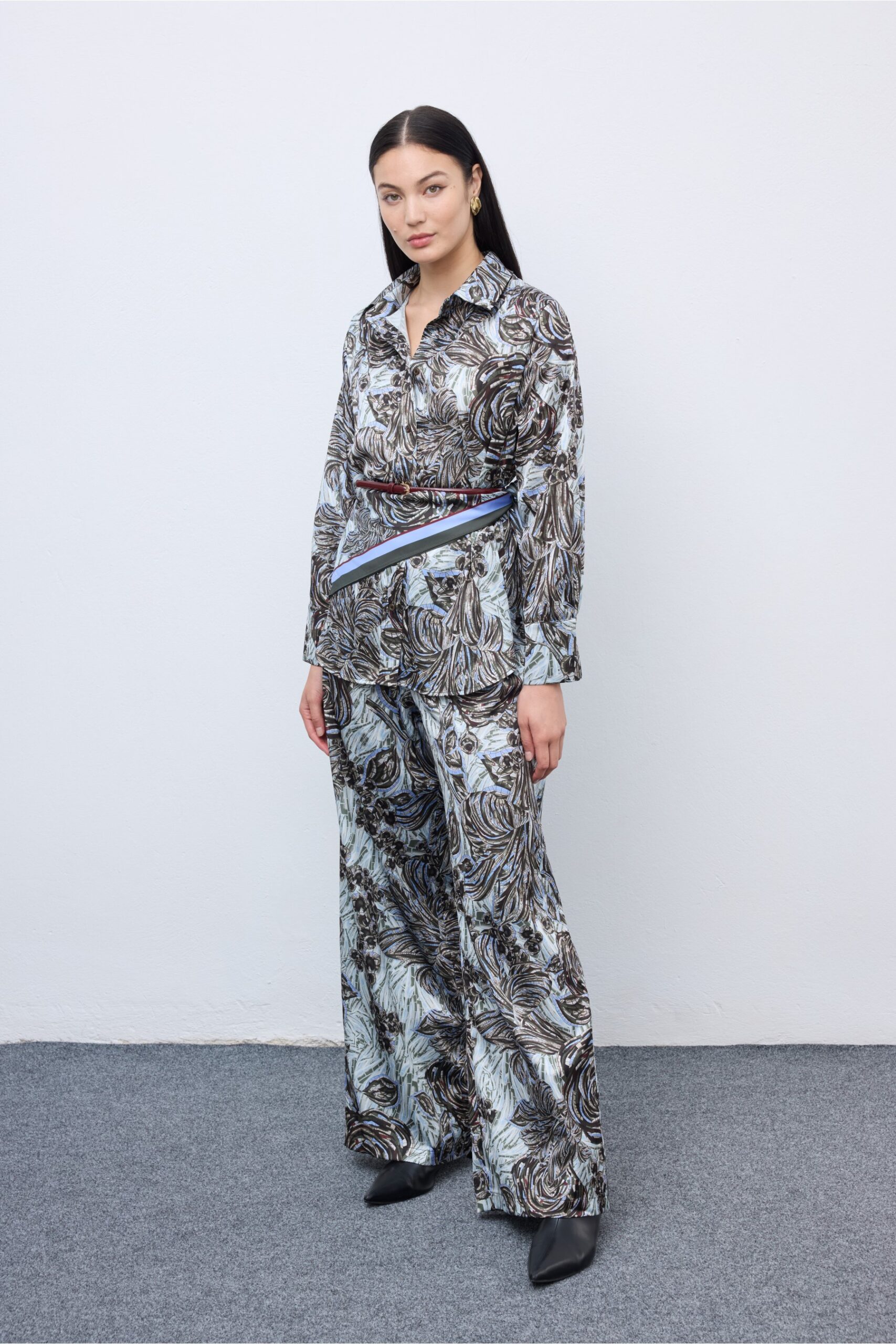 The Mosaic Silver Athesis Pyjama Set blends fluid elegance with bold artistry – a true statement piece for every modern muse. Crafted from a soft, flowing fabric that moves beautifully with the body , this set features a relaxed silhouette, wide-leg trousers and a deep V-neckline for a touch of understated allure. Its print captures the spirit of freedom and modern femininity-perfect for both refined evenings in and elegant outings.