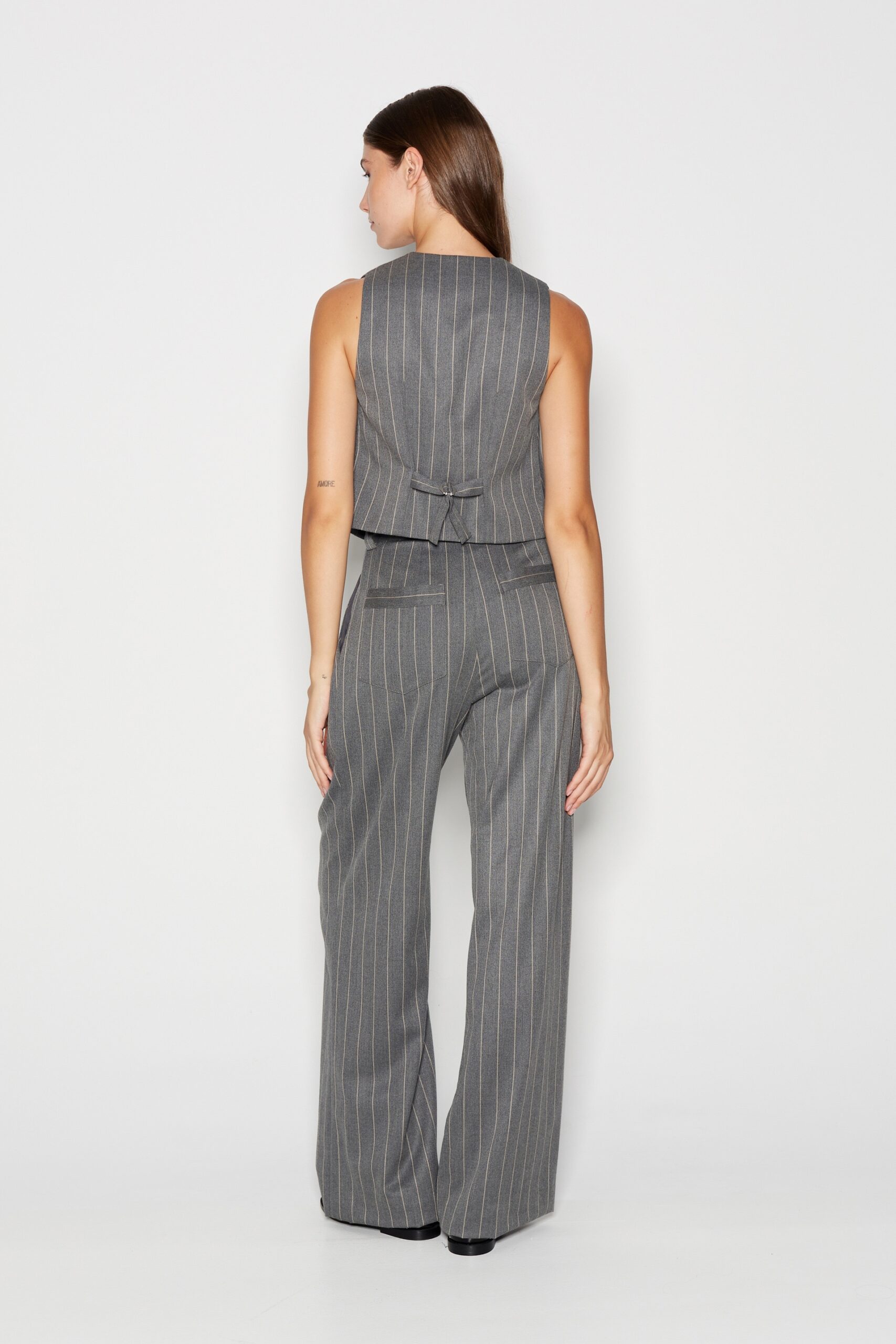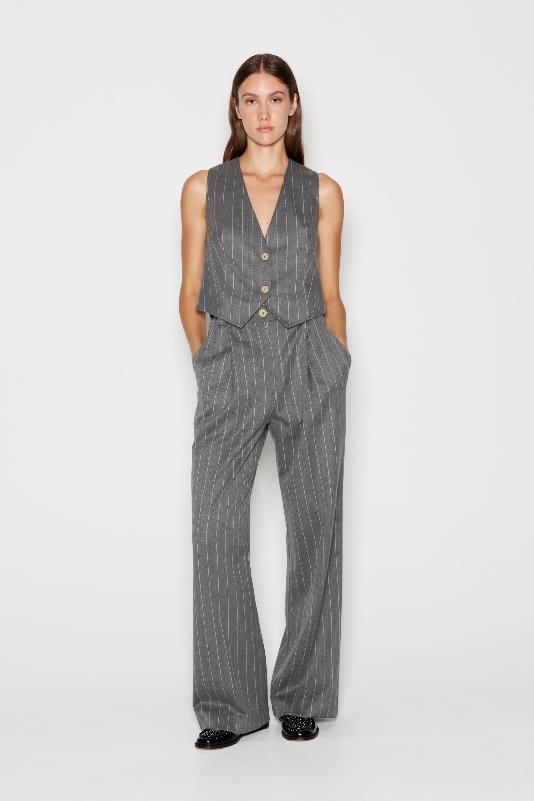 The Storylines Vest effortlessly elevates your style, whether worn solo or layered over a slim-fitting white tee. Crafted from a soft viscose blend, this piece boasts classic pinstripes. When styled with the coordinating trousers and blazer, the Storylines vest creates a cohesive look that radiates confidence and elegance, perfect for those who appreciate the fusion of comfort and chic fashion. Mix and match it with various tops and accessories to express your unique fashion sense.