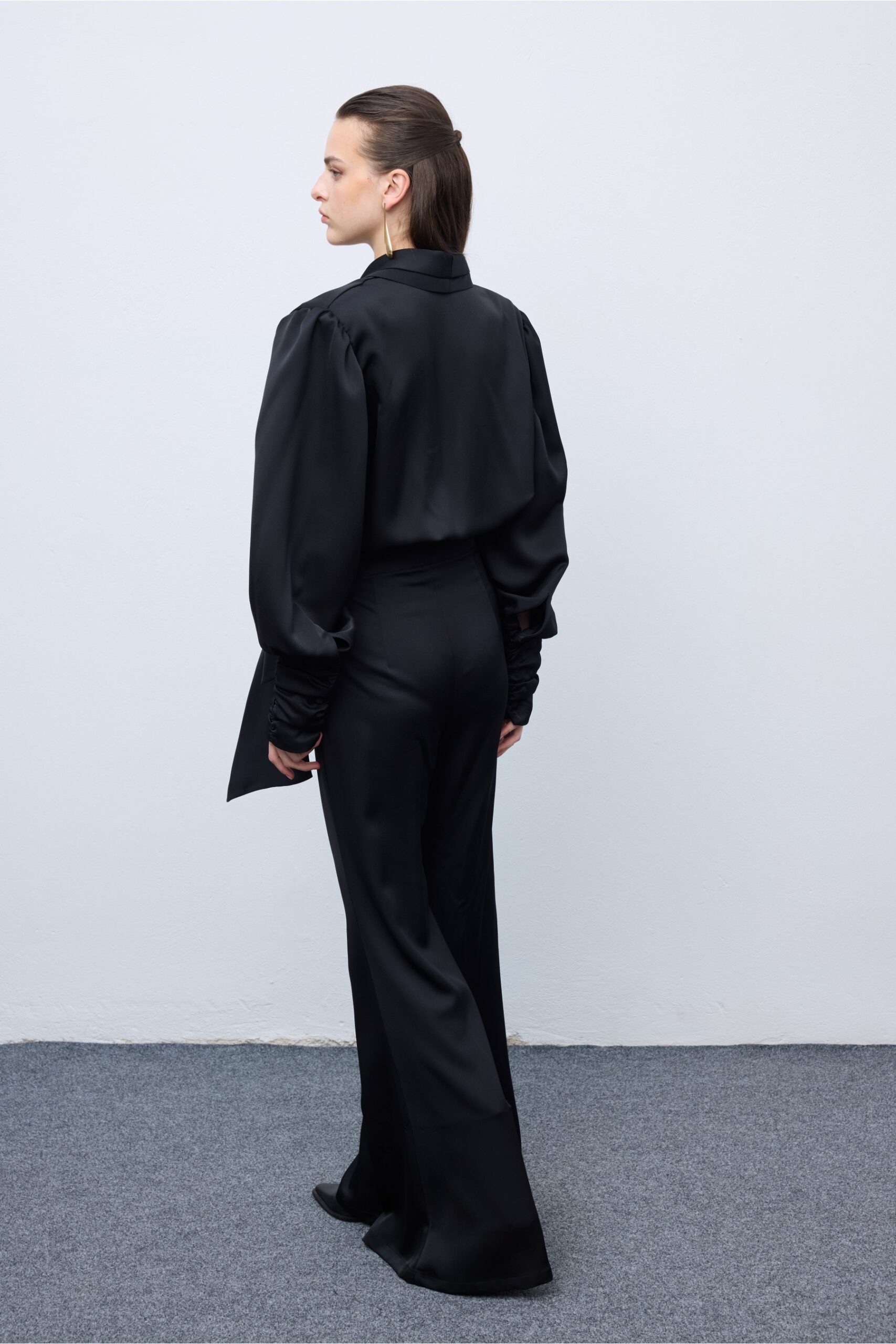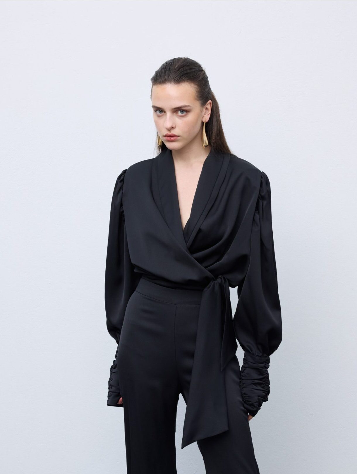 Effortlessly refined, the Total Black Shirt embodies understated sophistication. Crafted from fluid, lightweight fabric, it features a deep crossover neckline and a self-tie waist that cinches the silhouette with ease. Pair it with tailored trousers for a minimal , monochrome look that defines quiet luxury.